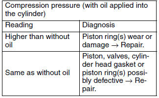 d. If the compression pressure is below the minimum specification, pour a teaspoonful of engine oil into the spark plug bore and measure again.