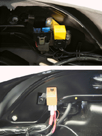 Front side Saddle opening switch Pre-installations Insert in clamp Fuse box From the wire unit Front left turn indicator connector Front right turn indicator connector Electric fan connector Turn indicator control device Right turn indicator connector From regulator Wire unit - regulator connection To the immobilizer aerial Light remote control Electric fan remote control To key switch Left turn indicator connector Voltage regulator Immobilizer aerial Foldable clamp to hold cables Battery negative terminal Battery positive terminal Flywheel - regulator connection To stop switch To turn indicator switch To light switch To horn button To instrument panel To headlight To the position light To starter button To the engine stop switch
