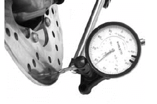 - Check the regular nature of the rotation of the brake disc assembly using the appropriate tool fixed onto the brake calliper as shown in the photo.