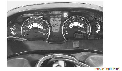 Check that the illumination LED on the meter panel lights up and the indicating needle each on fuel meter, speedometer, tachometer and coolant temperature sensor once moves to the maximum and then returns to the home position immediately after the ignition switch has been turned on.