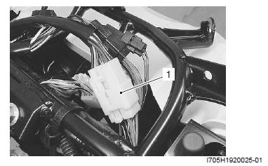 Inspect the passing light switch in the following procedures: 1) Remove the meter panel. Refer to "Meter Panel Removal and Installation". 2) Disconnect the left handlebar switch coupler (1).